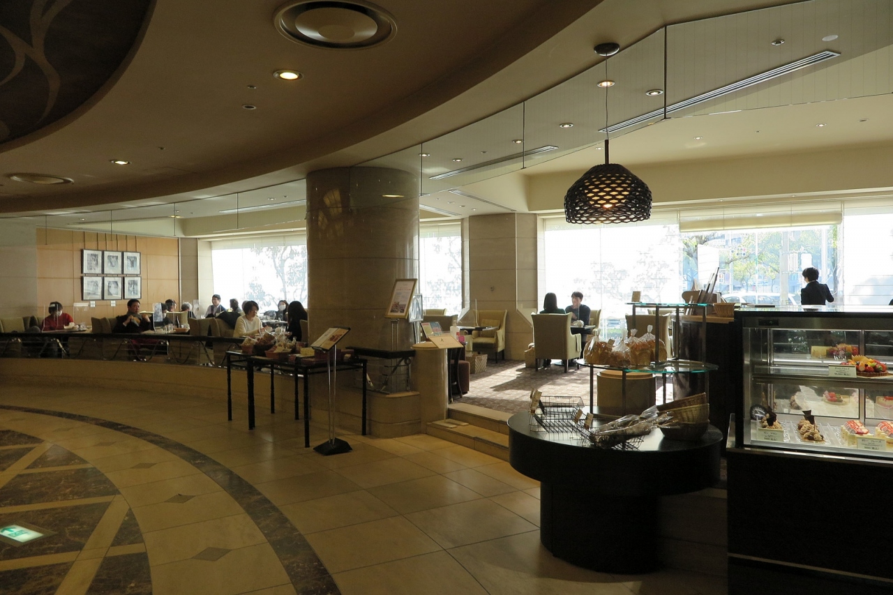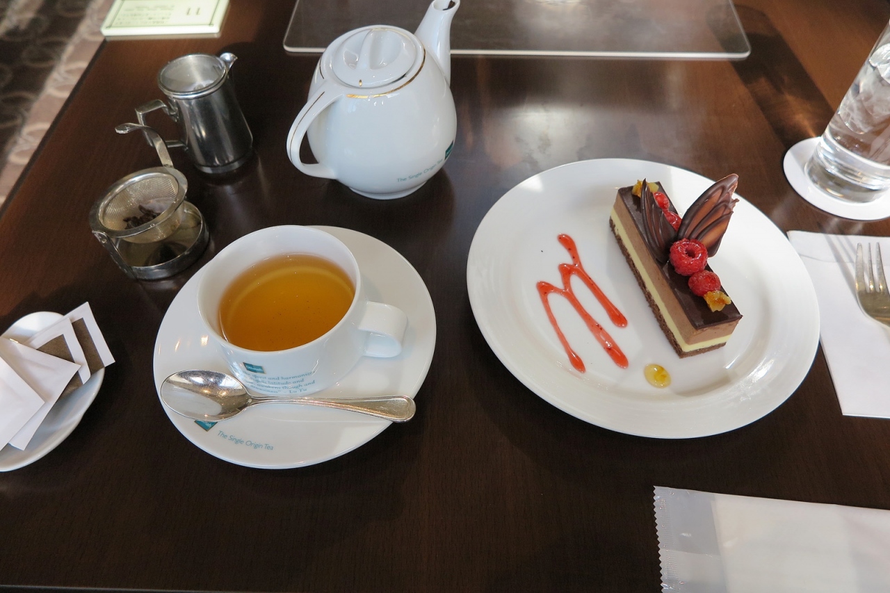 チェックイン時にいただいたウェルカムドリンク券とレストラン20%割引券を握りしめて「ロビーラウンジ」を利用しました。その名の通り、ロビーフロアにあって仕切りのないラウンジで席数41、テーブル間も広々というわけではないので、ロビーラウンジというよりもソファーの立派な喫茶店という感じです。またロビーはレストラン利用のお客さんが待ち合わせの場所に使われたりしているので、タイミング次第ではちょっと騒がしい雰囲気にもなります。今回注文したケーキはベルガモットチョコレート、おいしいですし値段も660円(20%OFFで総額528円)と高級ホテルのケーキとしては安いと思います。ロビースペースとの間に仕切りをつくって、少し座席数を減らせたら良いのになぁ…。