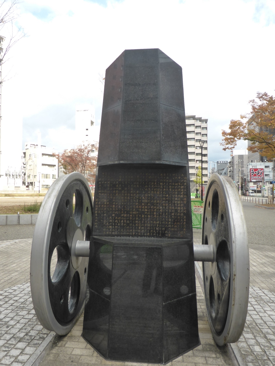 出来町公園は旧博多駅があった場所。現在の博多駅は1963年に移転してできたものでそれまではこの出来町公園に博多駅があったそうです。公園というよりはビルに囲まれた広場といった感じで、ちょうどお昼時に行ったら、近くで働く人々の休憩に使われていました。公園の片隅には「九州鉄道発祥の地」の碑が立っています。