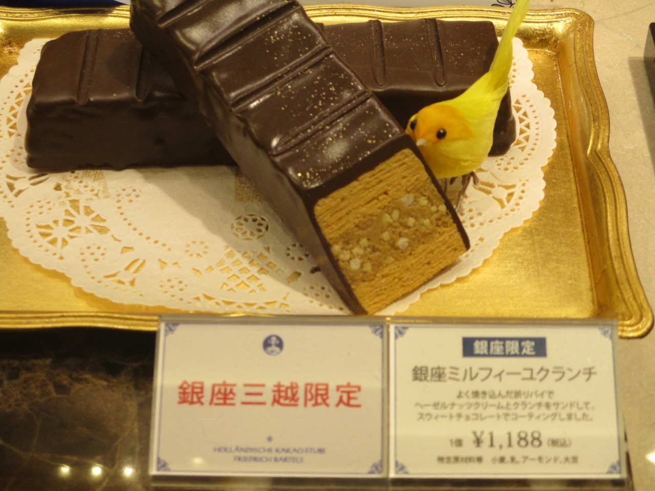 銀座三越の地下にあるバウムクーヘンのお店です。お店の名前などからオランダのお店と勘違いしていました。ドイツなんですね、ブルーのイメージカラー?とお店のマークがおしゃれです。こちらには銀座三越限定の「ミルフィーユクランチ」もあります。包装もきれいでおみやげにもぴったりです。