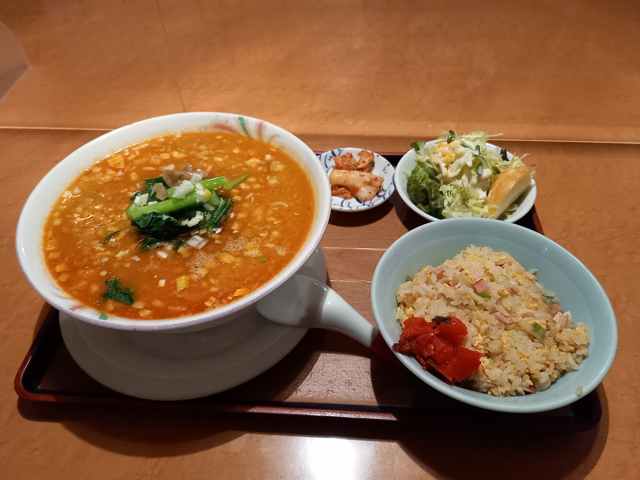 築館の旧国道4号線沿いにあります。旧国鉄バスの駅の近くです。店内は1階がテーブル席40席位で、2階もあります。メニューは麺類がラーメン650円から、飯類がチャーハン700円からあります。今回は四川担々麺750円に半チャーハンとサラダのセット250円を追加でいただきました。担々麺は辛みはおさえ目、ひき肉たっぷりの汁だくでした。チャーハンはしっとり目でした。他のメニューも汁だくでした。