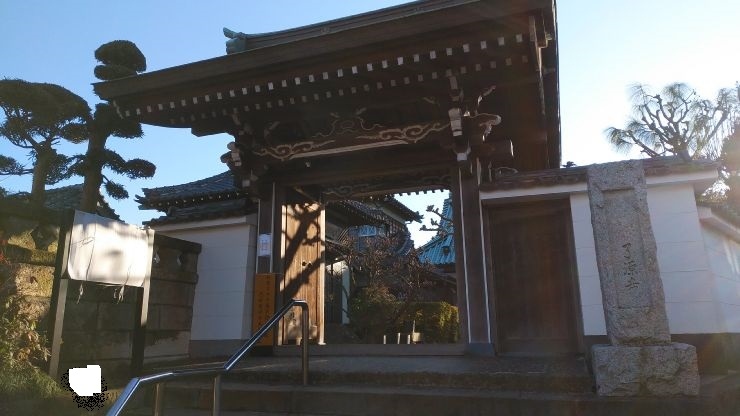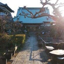 細い道沿いの住宅街の一角にある寺院。山門は立派で、中に入るとよく手入れされた庭木が落ち着きのある雰囲気を出していた。正面に見える本堂もお寺らしい建築のたたずまいだった。