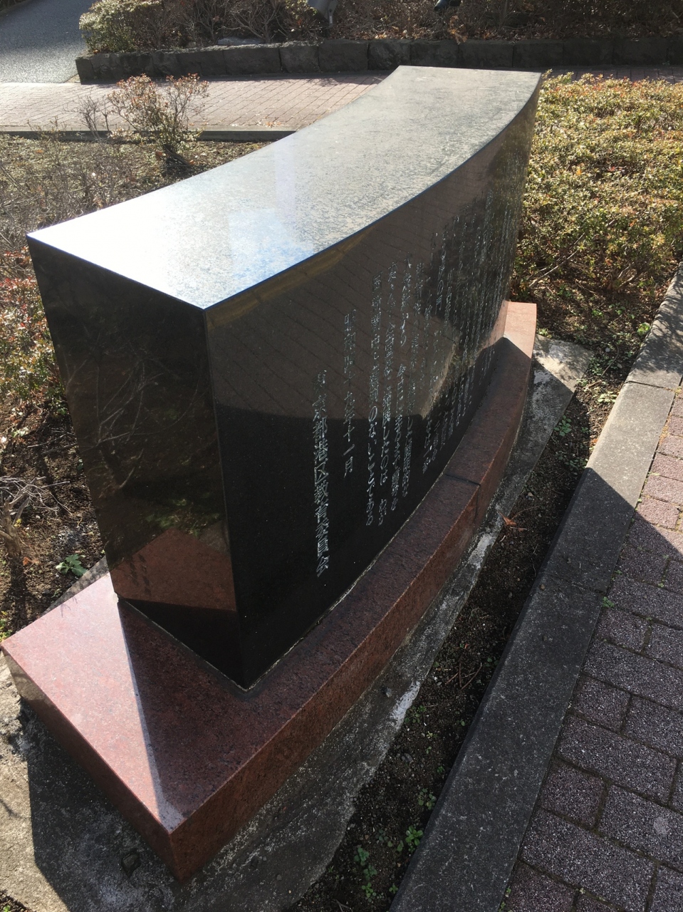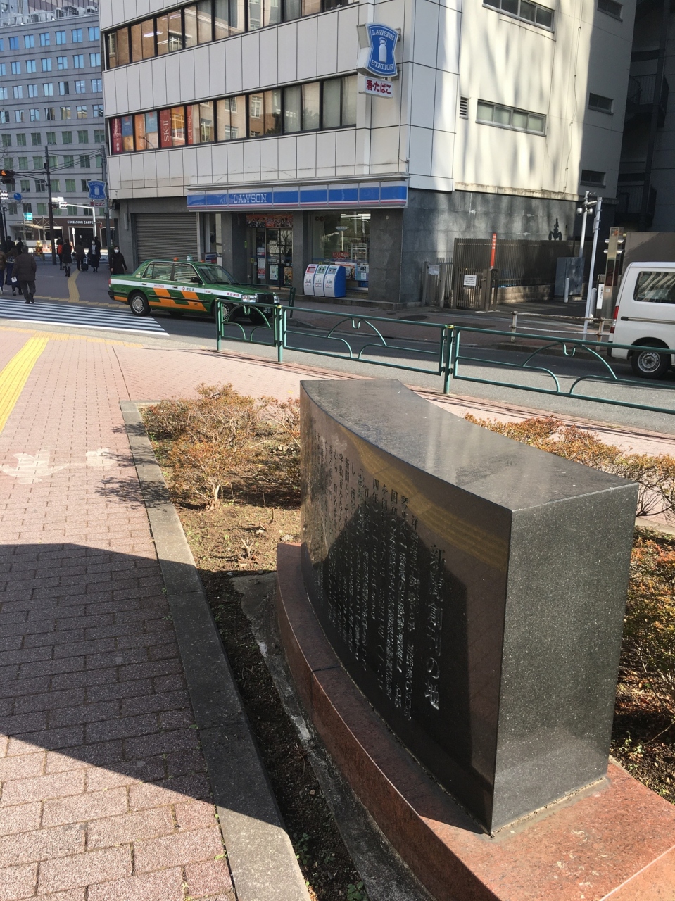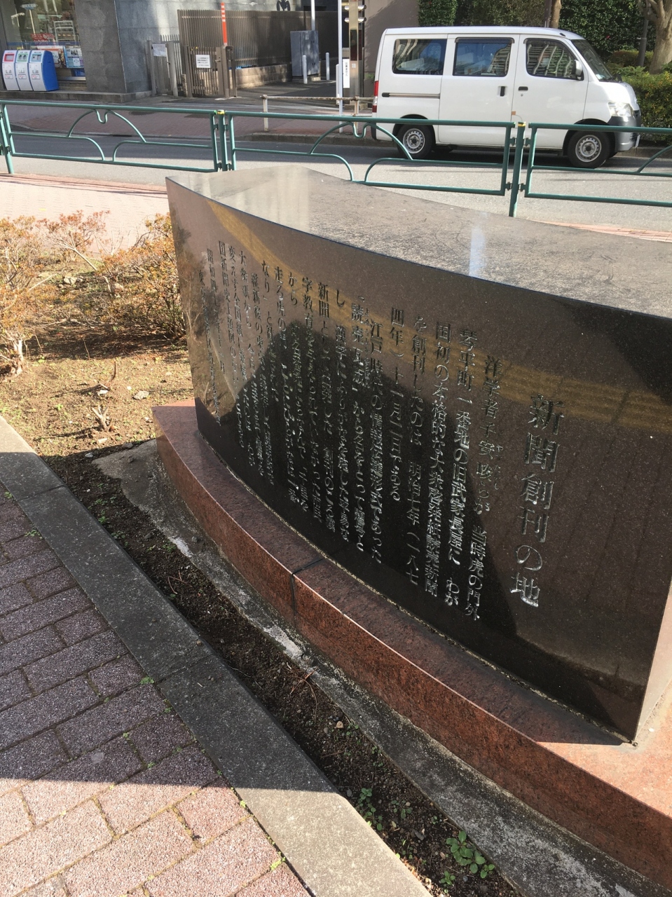 大通り沿いの歩道には面した三叉路にありました。黒い横長の石碑でしたが高さがないので目立たず人通りが多い場所ながら見逃してしまいそうな石碑でした。石碑には文字が記載され、国内初の大衆紙、読売新聞のことが書いてありました。