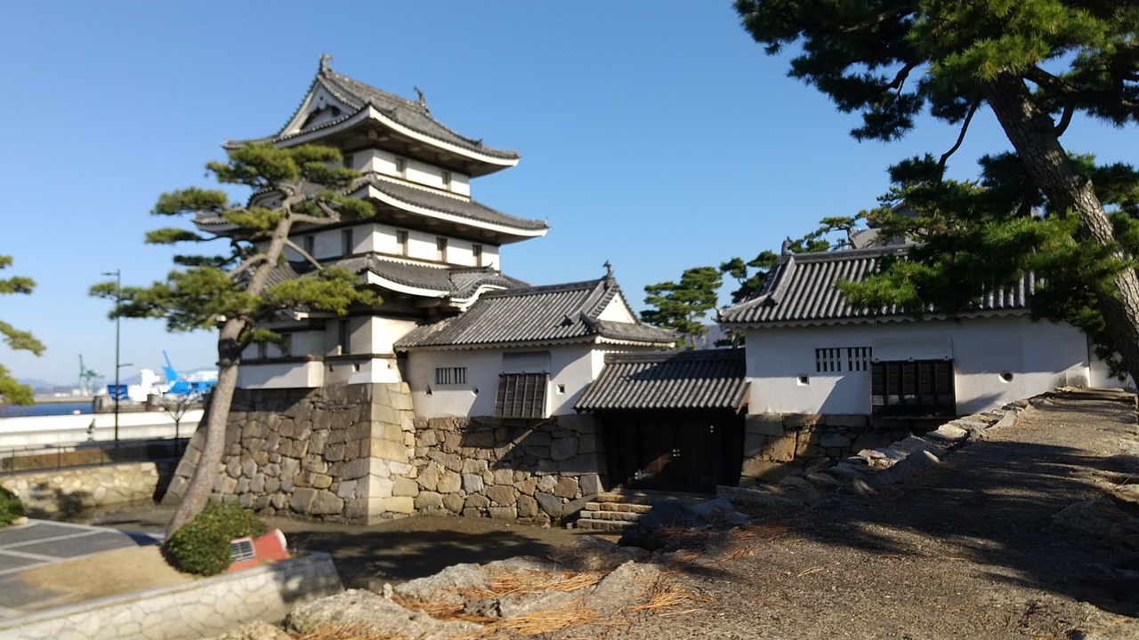 高松城は残っている遺構が天守台、鞘橋(明治期のもの)、月見櫓、艮櫓くらいで、少ないです。しかし、高松城のアプリを現地で起動すると、スマホの画面越しに、往時の高松城がCGで復元されていて、良かったです。