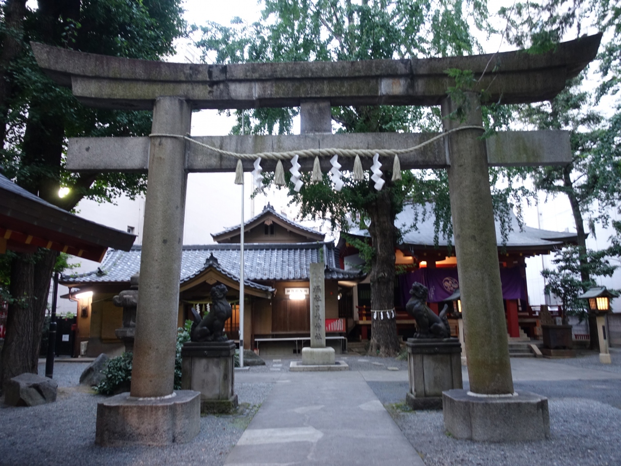 茅場町駅の北側、みずほ銀行の北側にある神社です。この辺りは神社やお寺の多い場所でもあります。ビジネス街の中で、静かな神社です。訪ねたのは、平日でしたが、私たちのほかは会社員を一人見かけただけでした。歴史は古く、1800年の江戸名所図会には描けれているそうです。狛犬が天仰ぐ姿で珍しく、関東大震災後、運気上昇を願い昭和9年に奉納されたものだそうです。