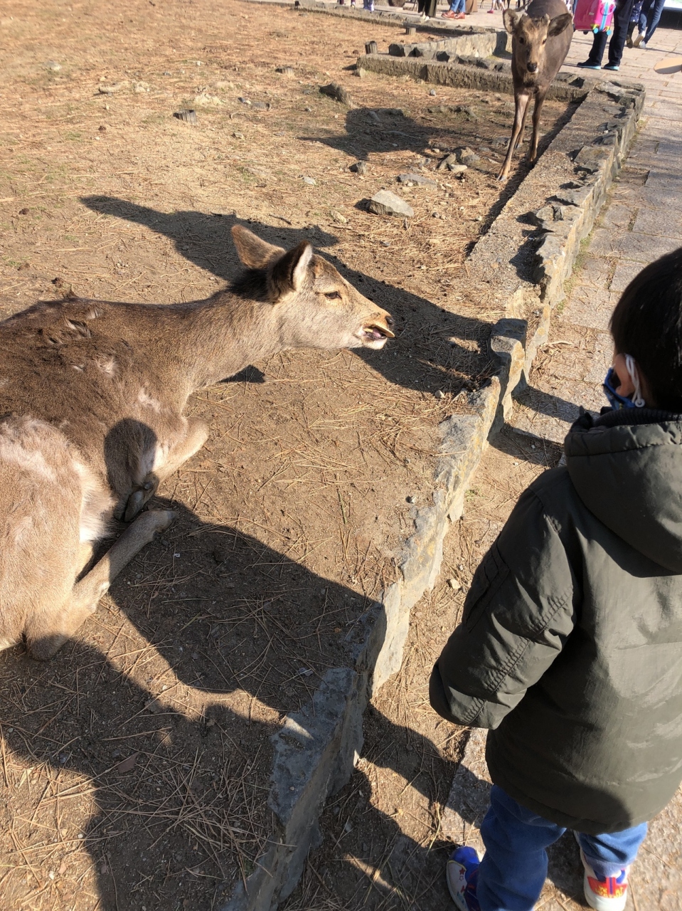 とっても可愛いけど、怖がりの我が子の兄はビビっていました。弟の方が楽しんでせんべいをあげていました。