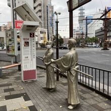 路面電車の走る県道21号「時標(ときしるべ)」です。全部で7カ所あるようで、後で知ったのですが、案内板にあるQRコードでそのシーンについての動画が見れるそうです。コロナ禍においては、銅像もマスク着用なのですね(笑)