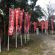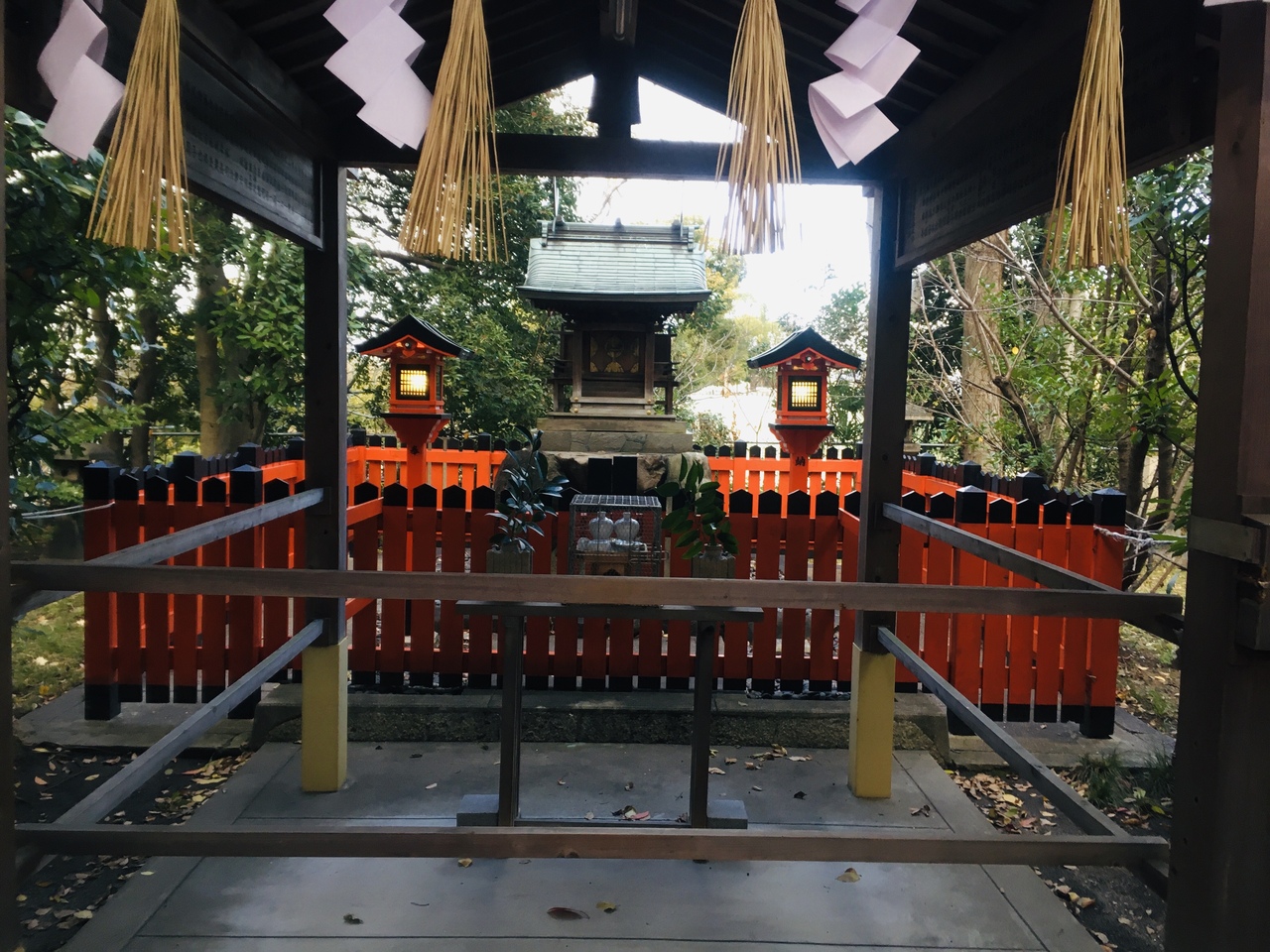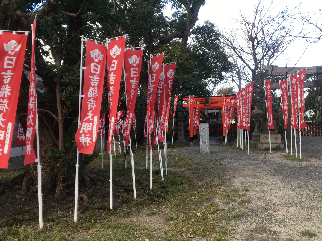 大阪地下鉄谷町線「四天王寺前夕陽ヶ丘駅」から徒歩で5分ほどです。四天王寺の鎮守社として「天王寺七宮」の一つの大江神社の摂末社です。本堂の左手に赤い「日吉稲荷大明神」幟が何本も立ち並ぶその奥に「百度石」、そして社殿が祀られています。お隣には毘沙門堂跡地の前に阿吽の「狛虎」が祀られていました。
