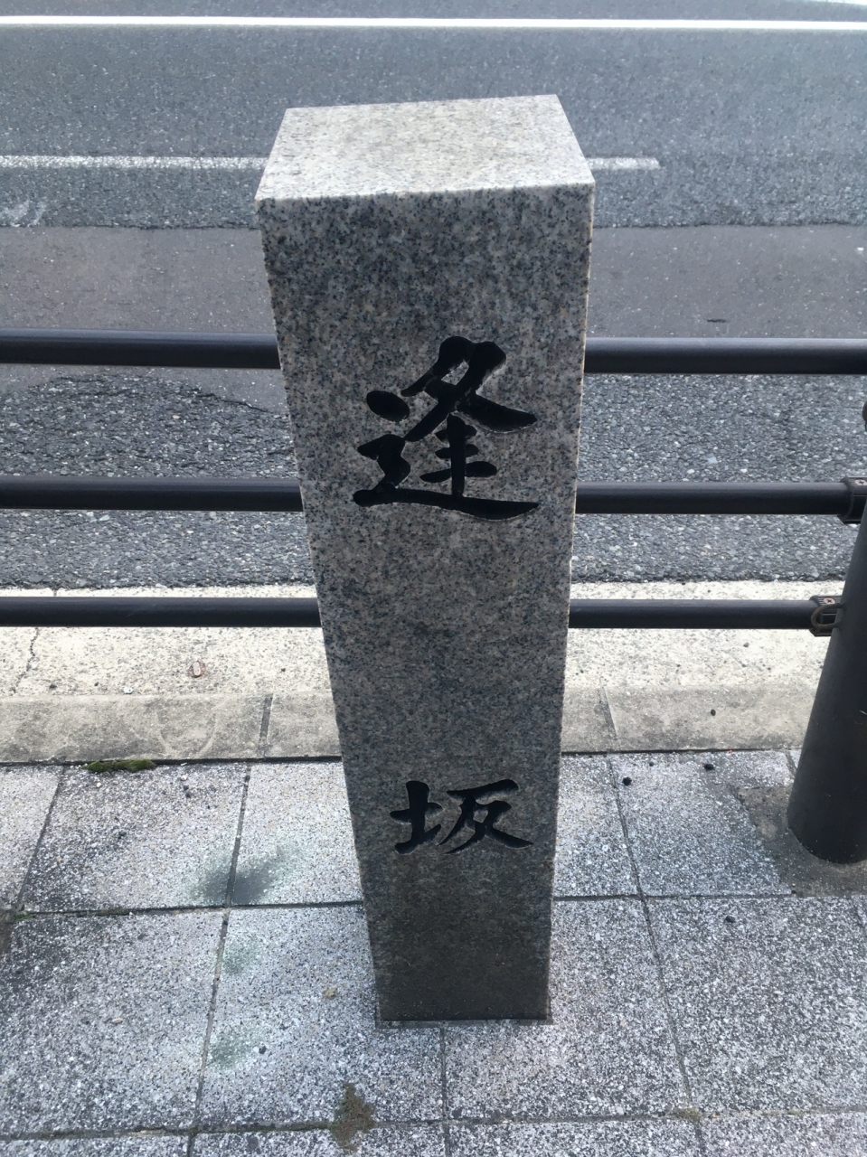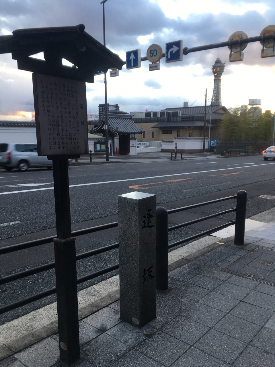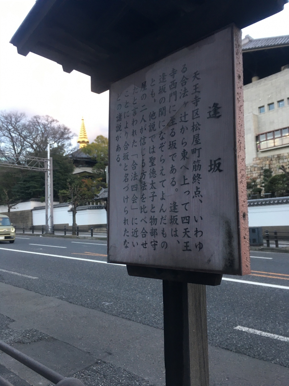 現在は国道25号線の合法ヶ辻から東へ上って四天王寺西門に至る坂です。上町台地の西端から東へ上るいわゆる「天王寺七坂」の一番南にある坂ということです。名前の由来は京都から滋賀へかけての「逢坂の関」になぞらえたという説と聖徳太子と物部守屋が2人の信じる方法を比べ合わせた「合法四会」に近いことで「合坂」とか、諸説あるとのこと。歩道に立札と石碑がありました(安居神社の前あたり)。