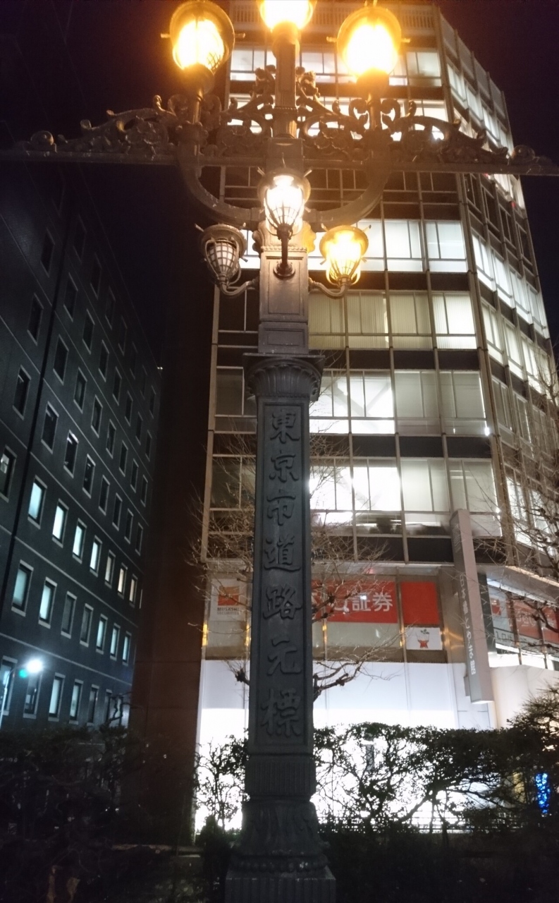 日本橋の中央にあった「東京市道路元標」は、東京都電の架線柱として使用されていましたが、昭和47年の道路改修で日本橋のたもとにある「元標の広場」に移設されてみることができます。