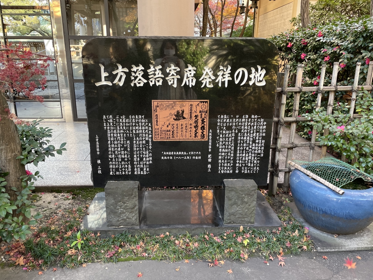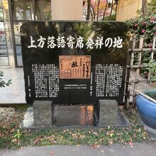 本町駅からすぐのところ、通称「ざまさん」の名で親しまれる坐摩神社境内にあります。江戸時代の寛政年間に、寄席の開祖と呼ばれる初代・桂文治が初めて寄席を開いて興行したことを記念して建てられました。これらもこのような古典芸能を継承していく大切さを感じました。