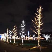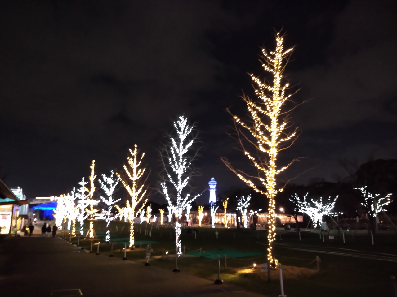 てんしばのエリアに限られますが、イルミネーションの飾りがされていました。芝生育成中のため立ち入れないエリアもありますが、夜も昼間同様芝生のエリアに入れます。天王寺ではハルカスガーデンとてんしばがイルミネーションスポットになっています。