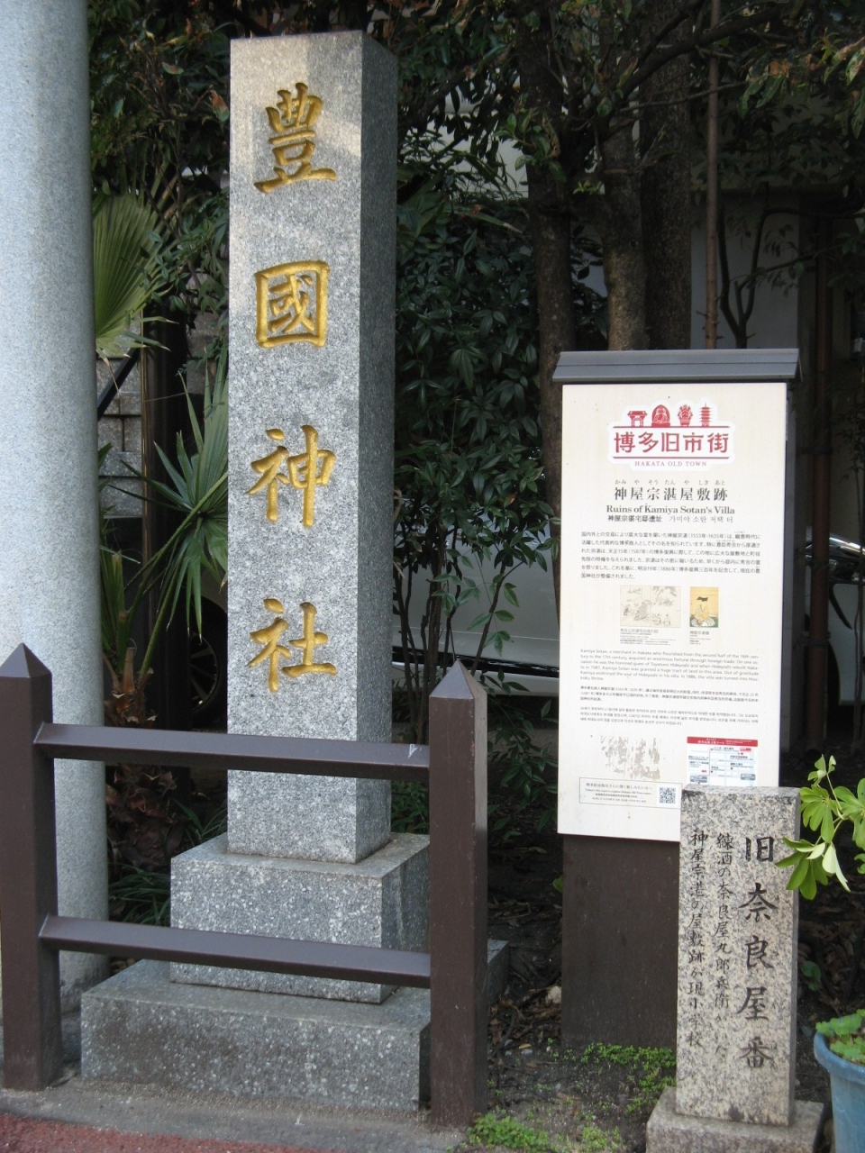 呉服町駅から歩いて3分ほど、博多小学校の傍に鎮座されています。博多を代表する商人であった神屋宗湛の屋敷があった場所で現在は建物などの遺構は全く残っておらず、豊臣秀吉との関係からか秀吉を祀る豊国神社が鎮座されています。神社自体は大変小さなもので、特別、観るものは無く、歴史に興味がなければわざわざ訪れることはないかも。