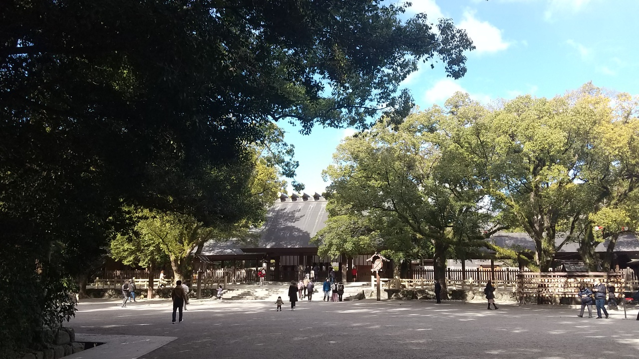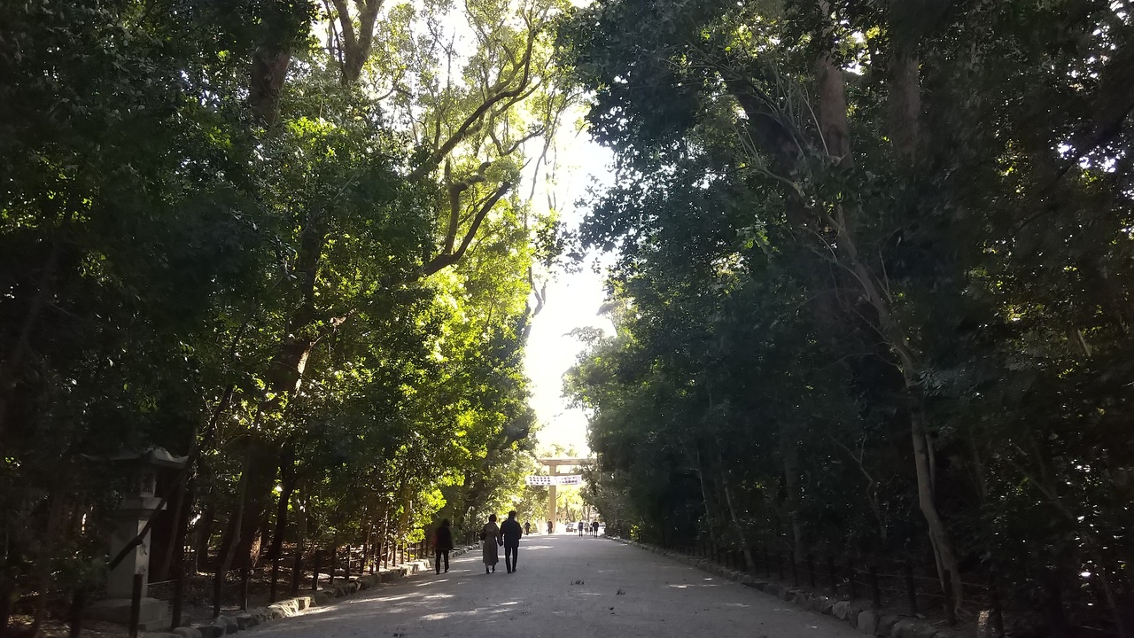 熱田さんの鳥居をくぐり参道を歩くと 清々しい空気に包まれます。本殿に参拝する日はいつも快晴で青空。