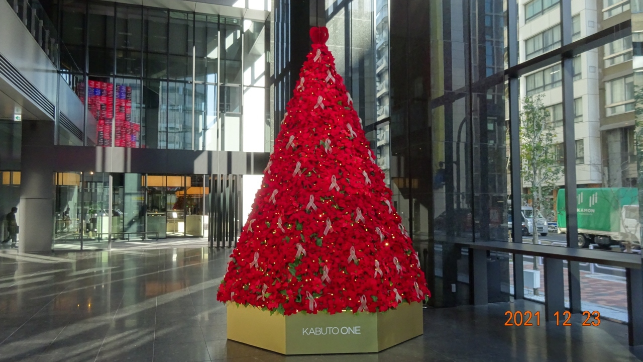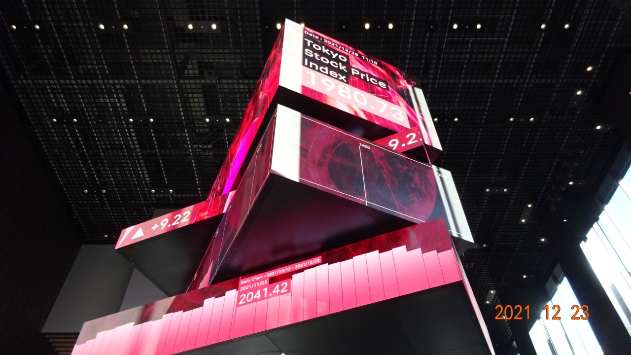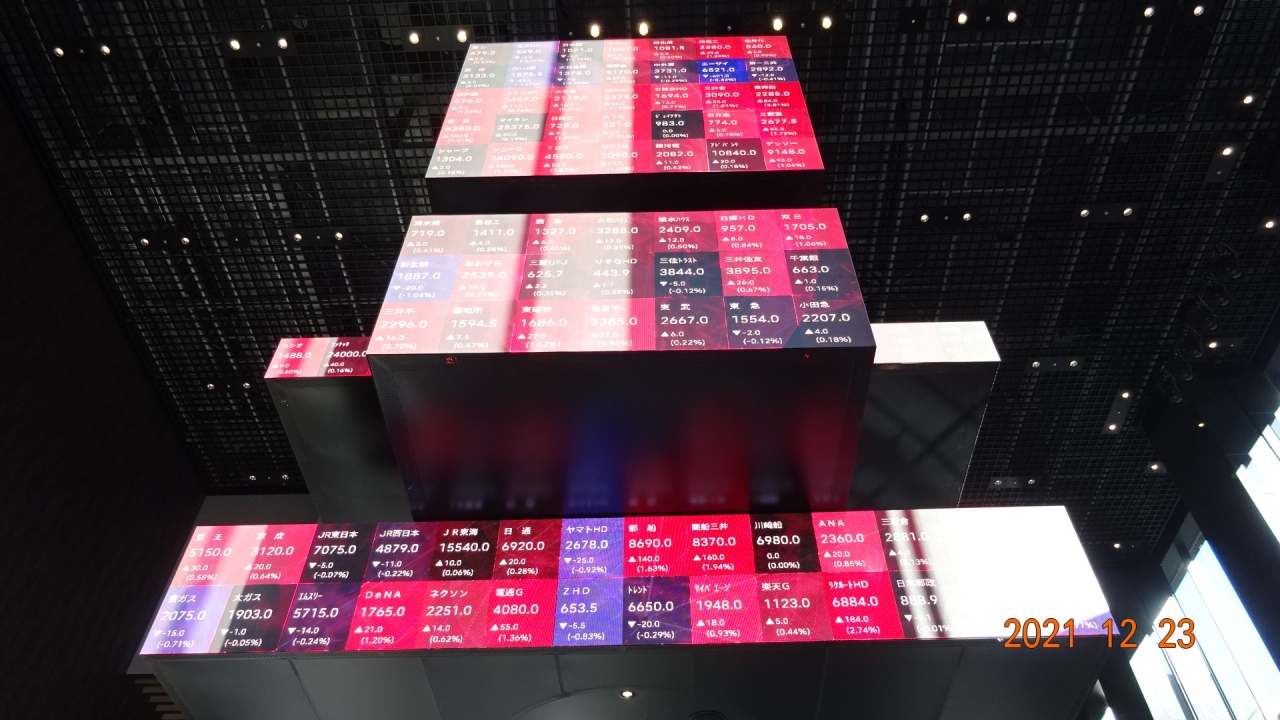 東京メトロ日比谷線茅場町駅から平成通りを曲がって東京証券取引所に向かおうと思った時に、いきなりビルの大きな窓から室内に巨大なキューブ型ディスプレイが見えました。