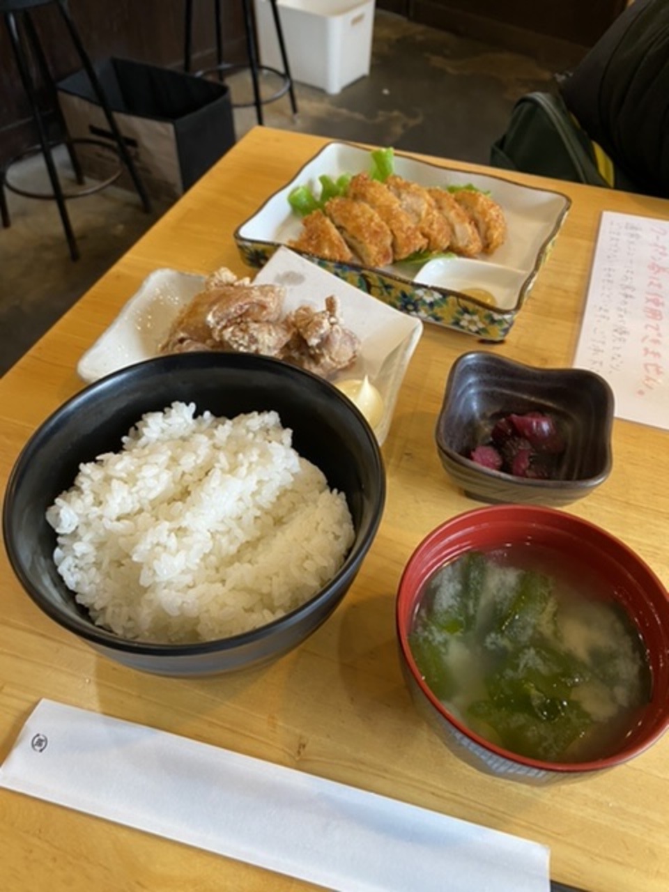 ランチはメニューから2品選ぶスタイルのワンコイン500円!ライス、味噌汁、漬物が付きます。この日の日替りはチキンカツ。チキンカツと鶏唐揚げにしました。500円でライス、味噌汁おかわりサービスです。
