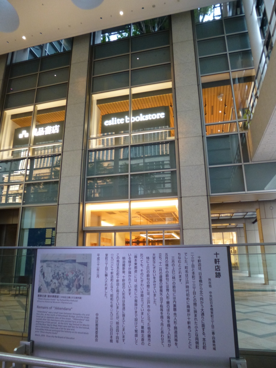 日本橋の中央通り沿い、オフィスや商業施設、ホールなどを有する大型複合施設、コレド室町テラス。中央通り沿い、屋外オープンスペースの手前に、十軒店跡の案内があります。江戸時代日本橋通りの両側で雛市が立ったそうで、十軒の仮店があったそうです。その後五月の節句や暮れにも位置が立つようになったそうです。