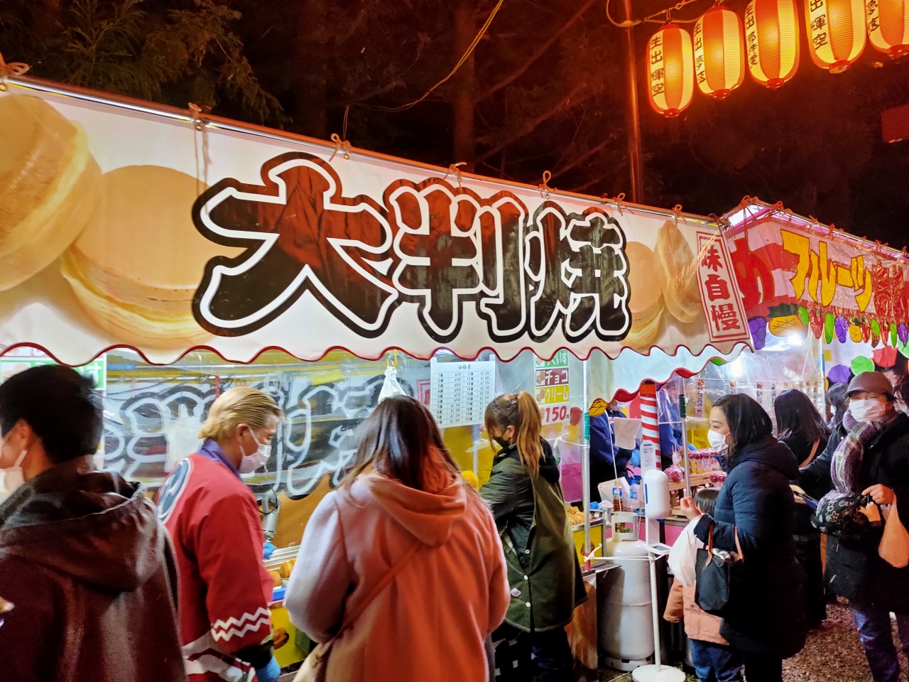 参道にはたくさんの露店が並び、食べるものには困りません。お年始の甘酒は勿論、やきそば、たいやき、クレープなど、お祭りの定番の食べ物が数多く食べられました。