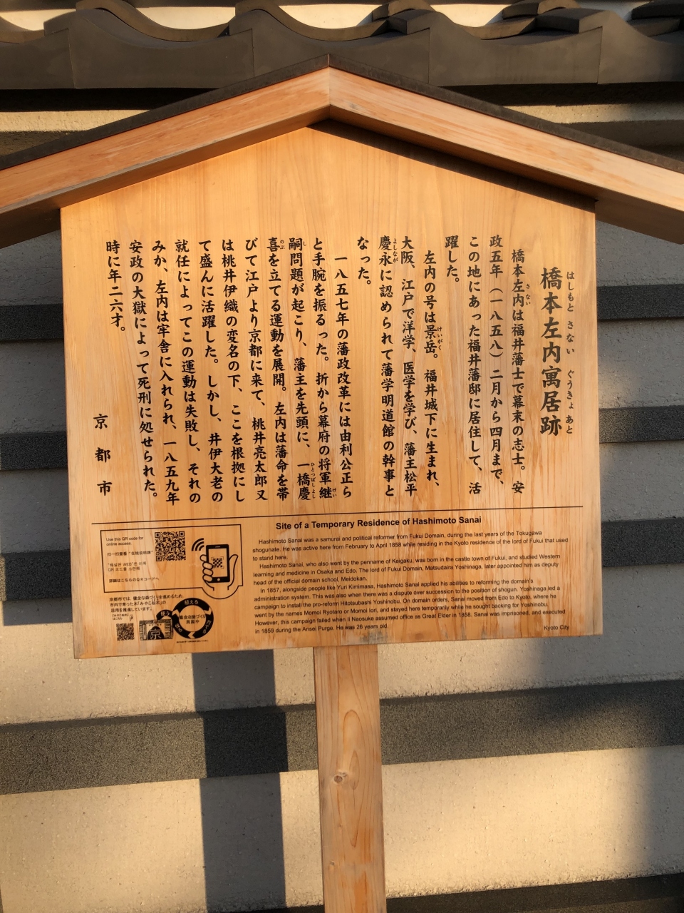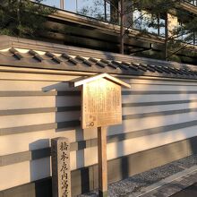 東堀川通り沿いのHOTEL THE MITSUI KYOTOの前にありました。石碑と立て看板が設置されています。かつて、ここには福井藩邸があり、福井藩士であった橋本左内も居住していたことがあったそうです。同じ通り沿いには、同じような碑の「福井藩邸跡石碑」もあるので、併せて訪れることをお勧めします。