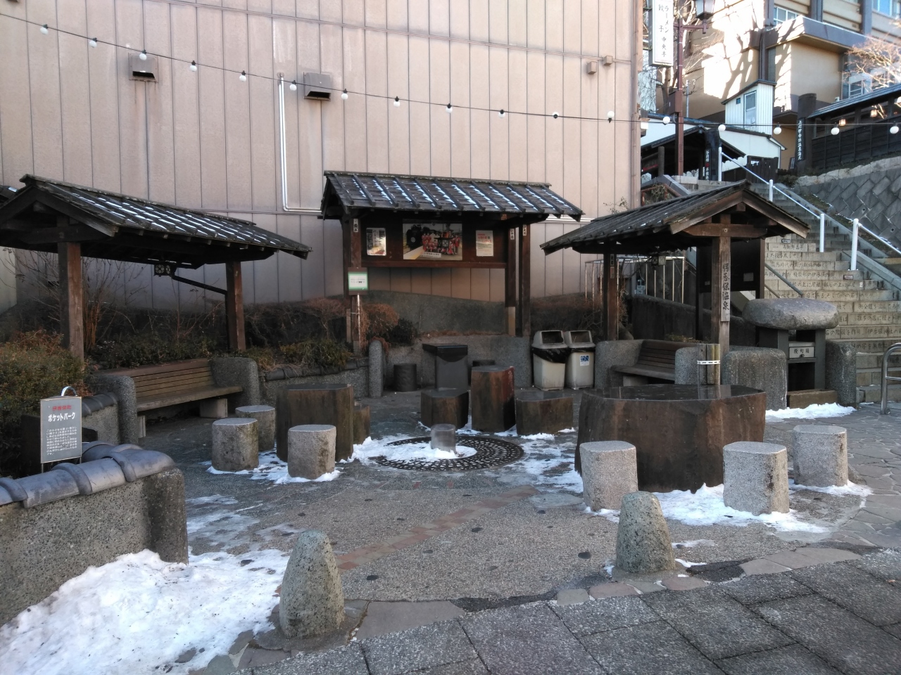 石段の下にいくつか有料の駐車場がありますが、「とどろき」に泊まったので、朝食後散歩に行きました。石段を上がった所にあって、休憩スペースになっています。隣の石段には与謝野晶子の句が彫られていて、俳句(?)の投函箱も設置されていました。