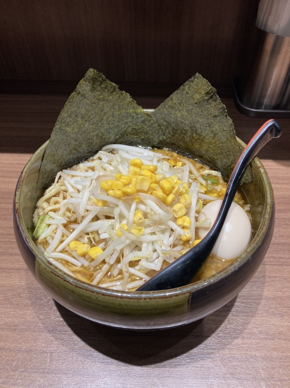 入口で食券を買ってカウンター席へ。煮卵の入った普通の味噌ラーメン・980円にしました。