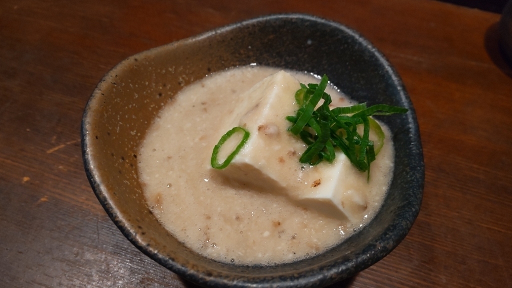 生ビールで乾杯し、お通しの豆腐に自然薯をかけたものを食べる。