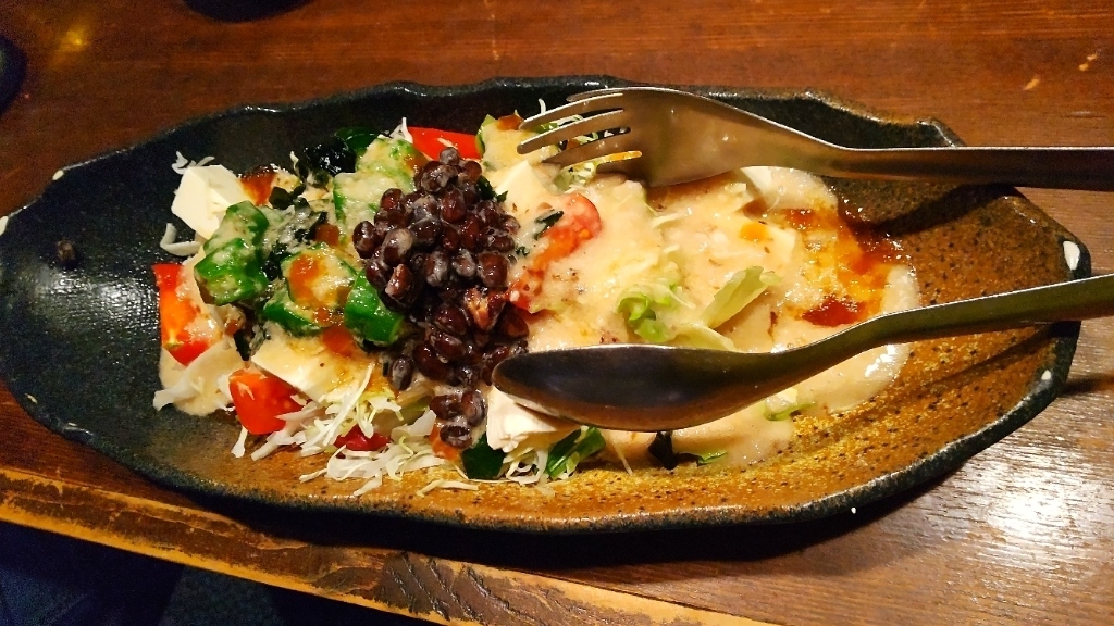 黒豆納豆ととろろが野菜にかかったもので、これまた美味しい。