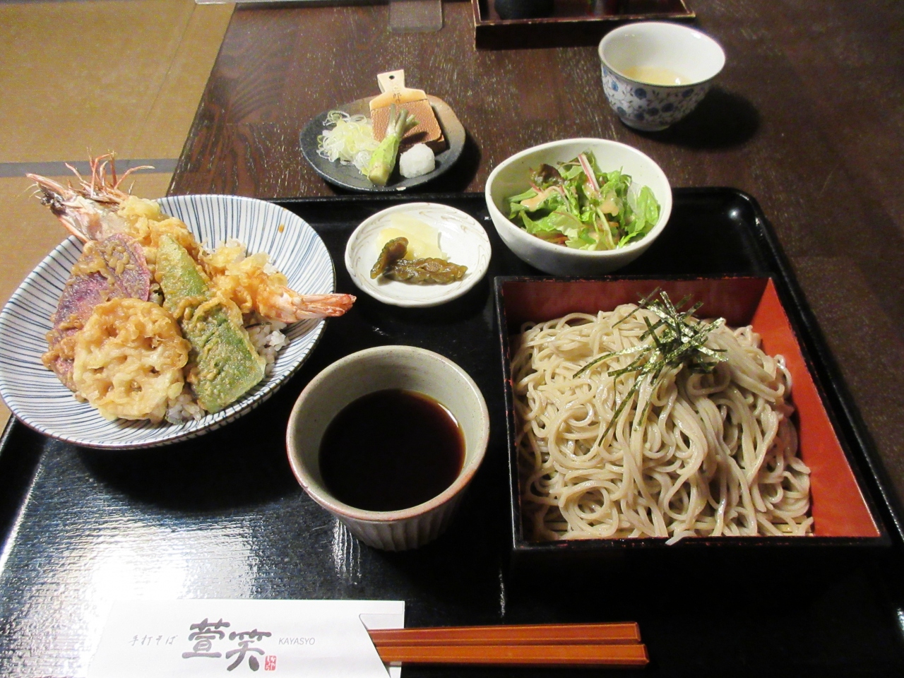メニューから、海老とそばを推しているようでしたので、海老天丼セット(ざるそば付き)にしました。海老は長さ15cmほどあり、身がプリプリでした。ざるそばはわざびを自分ですりおろして食べるスタイルでした。そばは細めでした。