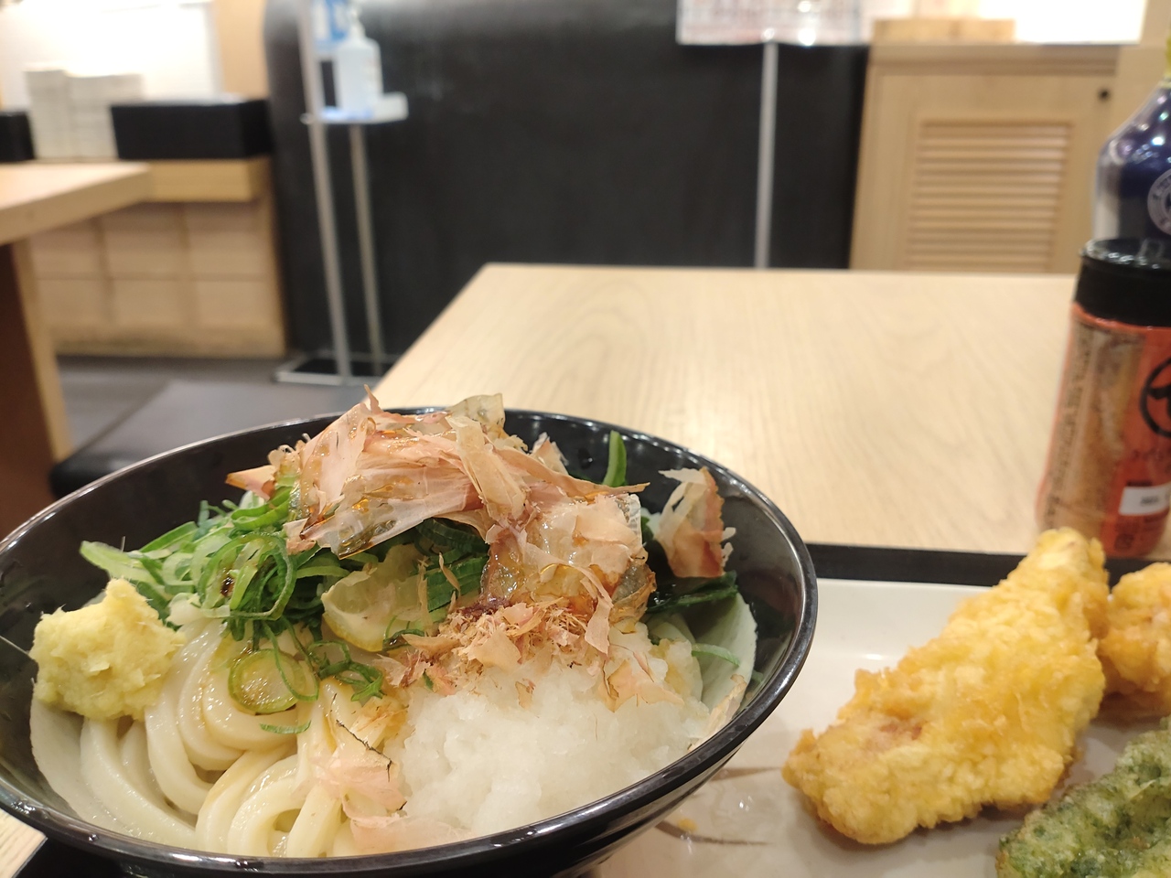 第2ターミナルの地下一階、京急線やモノレールの乗り場からアクセスしやすい場所にあります。冷たいおろし醤油とかしわ天などをいただきました。ふだんは多くの人が通行する場所ですが、開放的な構造になっており換気はバッチリでした。