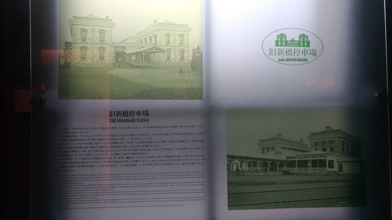 日本における鉄道の発祥は、新橋駅と横浜駅間を結ぶ蒸気機関車でした。かつての新橋駅だった場所にホームや駅舎の遺構が残されており、一部を活用した無料の展示スペースが設けられています。展示は少ないですが、時間を潰すには良かったです。