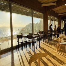 カフェスペースからも外のキレイな景色を眺められる、セルフサービスなので好きなだけゆっくりできると思います。小さな売店もあり、伊豆お土産が売られています。
