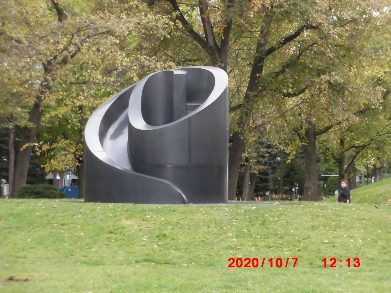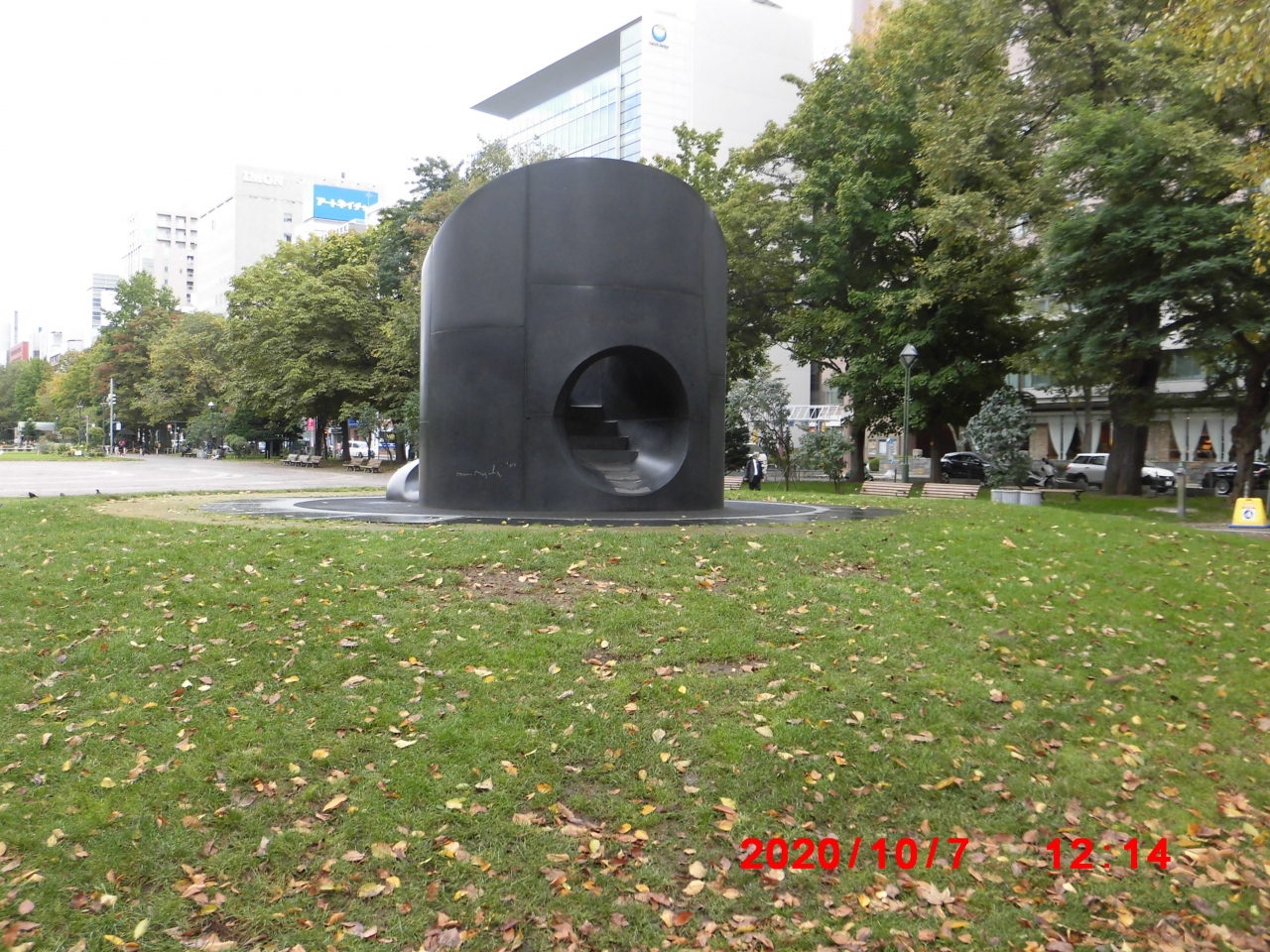 札幌市観光で立ち寄りました。有名な大通公園のさっぽろ雪まつり 大通り8丁目会場エリアの中ほどにあったユニークなオブジェでした。構造と名称からは滑り台でもあるみたいでした。作者は有名な彫刻家のイサム・ノグチ氏で、黒御影石作品です。