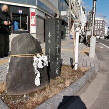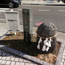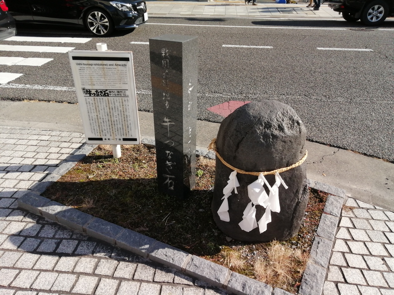市内中心部、本町通りの「信毎メディアセンター」前の交差点の角にぽつんと佇んでいます。その昔、上杉謙信が武田信玄側に塩を送ったことで生まれた「敵に塩を送る」という故事にまつわる石だそうです。かつての道祖神で、牛を繋いでいた石ではないとのこと。名前が紛らわしいです。