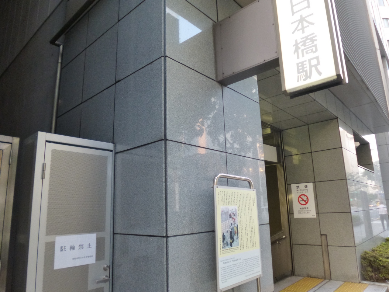 新日本橋駅4番出口の脇に、案内板が立っています。江戸時代、ここに長崎屋という薬種屋があり、出島のオランダ人商人たちが江戸城に挨拶に行く時に、ここに滞在したということです。商館長たちにはシーボルトなど、一流の医師たちも同行していたので、平賀源内など蘭学に興味のある日本人の医師や蘭学者などが多く訪れ、江戸における交流の場という大切な役割を果たしていたようです。