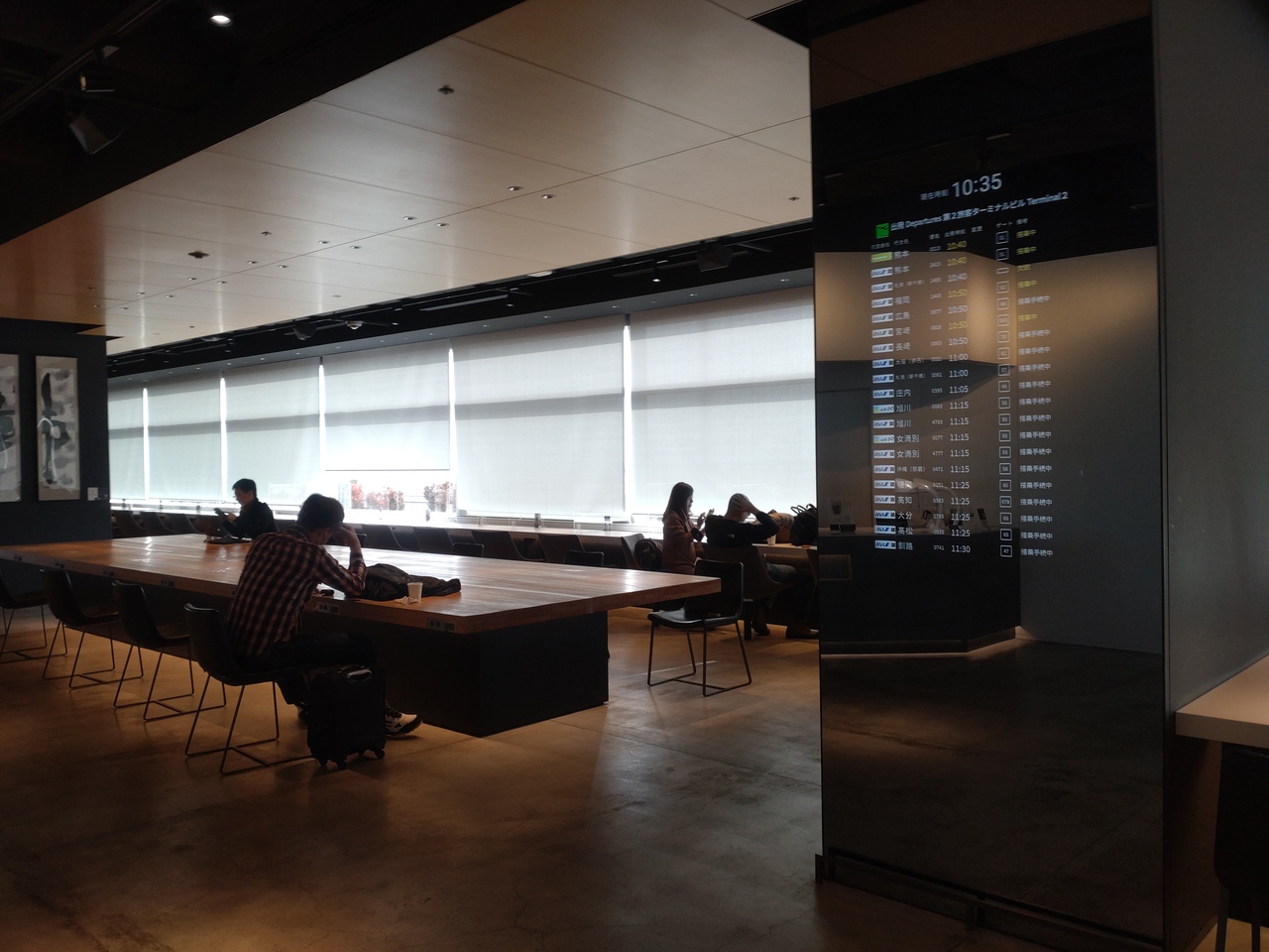 第2ターミナル北側の搭乗口からエスカレーターで上がったところにあります。広いターミナルなので搭乗時刻ギリギリまで過ごすことはできませんが、保安検査場通過後に利用できるので少しはゆったりできます。ヘルシーな豆乳入り青汁と黒酢ドリンクをいただけました。