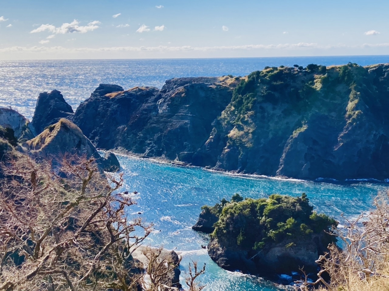 ここから少しだけ有名なヒリゾ浜が少しだけ見えます。冬季はヒリゾ浜への船は出ていないのでここから見るしかありません。紺碧の海と断崖絶壁が広がってますが、ヒリゾ浜の周辺は確かに海の色が違って見えます。