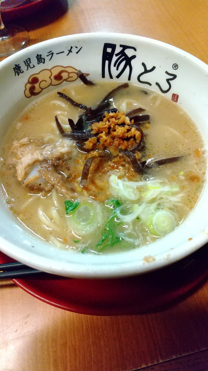 天文館にある人気ラーメン屋さん。カウンター5~6席と4人テーブルが5卓ほどの小さなお店ですが人気店で混雑していました。