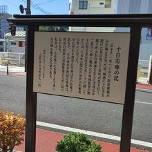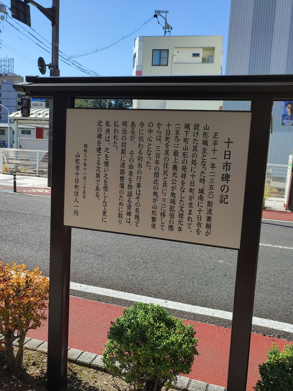 山形まるごと館紅の蔵から少し北に行った銀行の前にあります。名前の通りなのですが、最上義光によって城下町が整備された際に、十日市がここへ移されてきたそうで、地名にもなっています。今も市街地で中心部であったことがわかります。