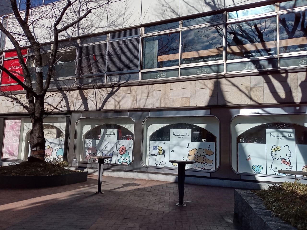 西銀座デパートの入り口にショップがあり、店頭には可愛らしいキティちゃんとマイメロディがお出迎えしてくれています。