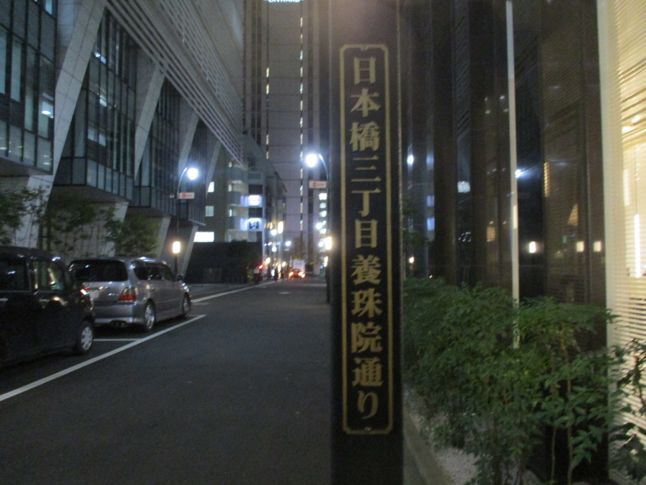 八重洲1丁目の外堀通りから日本橋3丁目の昭和通りまでを結ぶ道です。由来は「於満稲荷神社」にあります。徳川家康の側室、お万の方を祀っていて、院号が養珠院であることからこの通り名がついたそうです。夜に通ったのですが、ビルの間の裏通りのようなところで、神社も見当たらなかったです。日本橋高島屋に近いです。