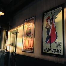 古き良き時代のアメリカ!という感じの木の壁に、近くにあるブロードウェイミュージックシアター(ビッグバンドビートの劇場)の公演やニューヨークデリのマイルハイデリサンドのダイナミックなポスターが貼られています。