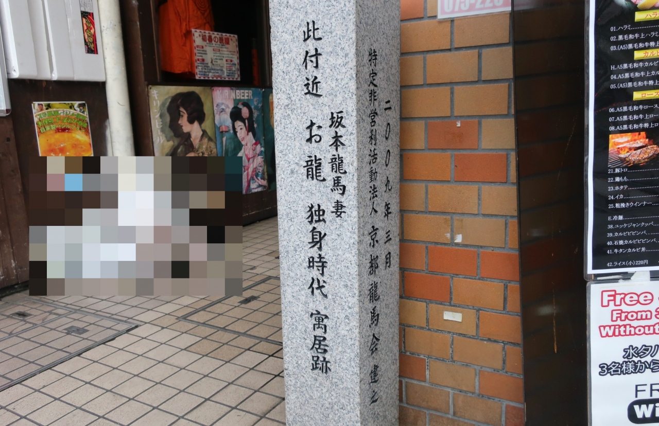 坂本龍馬の妻として知られるお龍が独身時代、このあたりに住んでいたという石碑だ。龍馬ゆかりの地に石碑を立ててt顕彰する活動に取り組む特定非営利活動法人が建立したものだ。大黒柱を失い困窮する一家を支えるお龍と知り合い、龍馬は「まことにおもしろき女」とひかれていく。そのロマンスの場所がこの辺りだという石碑だ。