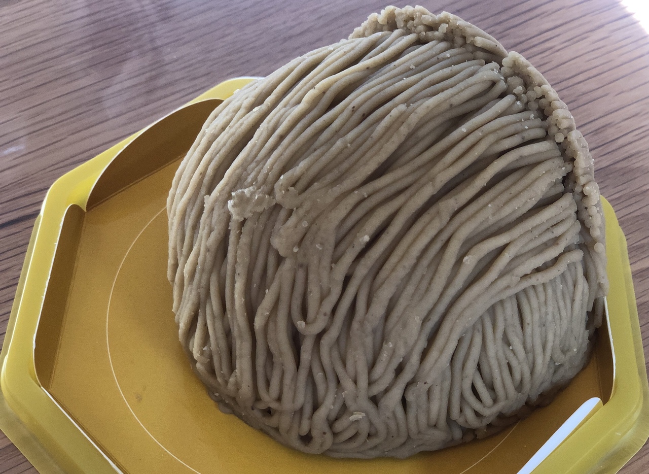 直径15センチくらいあり、高さも同じくらいある大型モンブランです。2~3人でシェアするのがちょうどいいボリューム感です。ケーキ屋さんで食べる洋菓子のモンブランではなく栗あんが使われていて和菓子を食べている感じです。生クリームのこってり感はなくあっさりしています。秋冬の期間限定商品のようです。