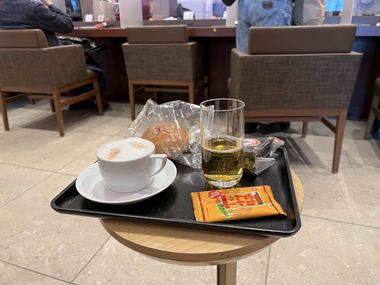 JALのダイヤモンドとJGCプレミア会員が利用できる専用ラウンジで、専用の手荷物検査場を抜けると、すぐ目の前にラウンジの入口があります。ラウンジの中ではおにぎりや菓子パンなどが自由に食べられますが、この中でもカレーパンは美味です。