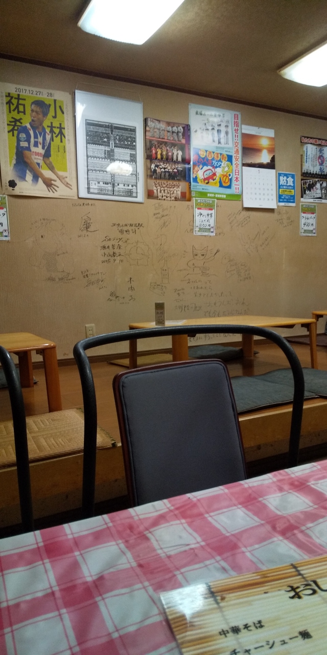雑多な店内は古い中華料理屋ですが壁には有名人と思しき人のサイン色紙や来客が書いたと思われる落書きがたくさん残っています。。