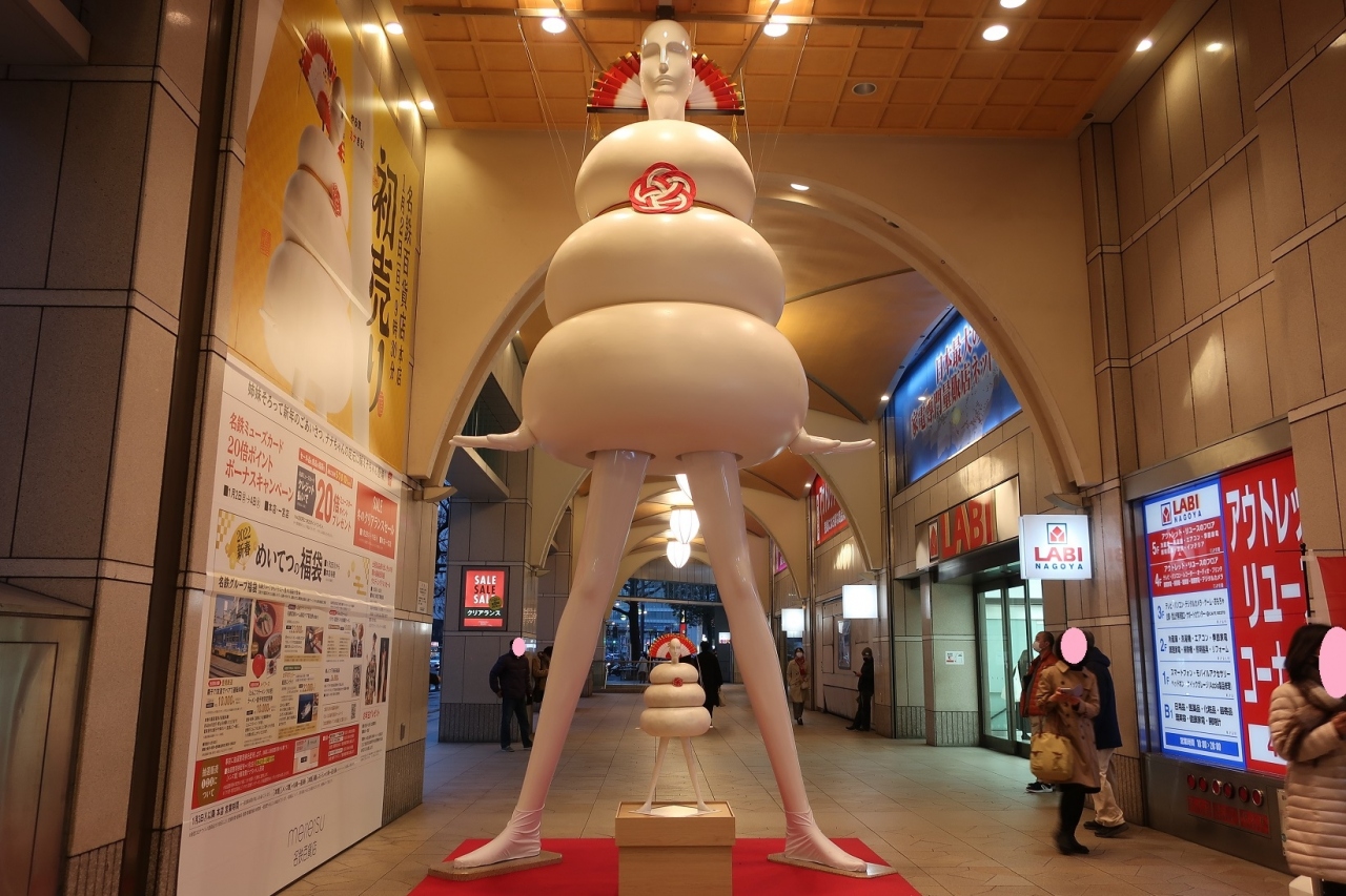 名鉄百貨店のメンズ館前のエントランスにいるナナちゃん人形!。名古屋へ行ったら見てみたいと思っていました。お正月が近かったので、鏡餅に包まれたナナちゃん人形に会うことができました♪。季節によって装いが変わるようなので、色々なナナちゃんが見たくなります!!!。