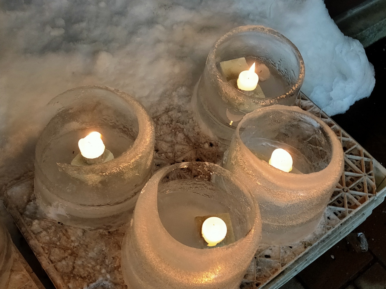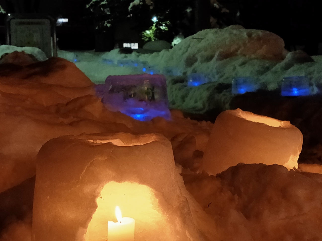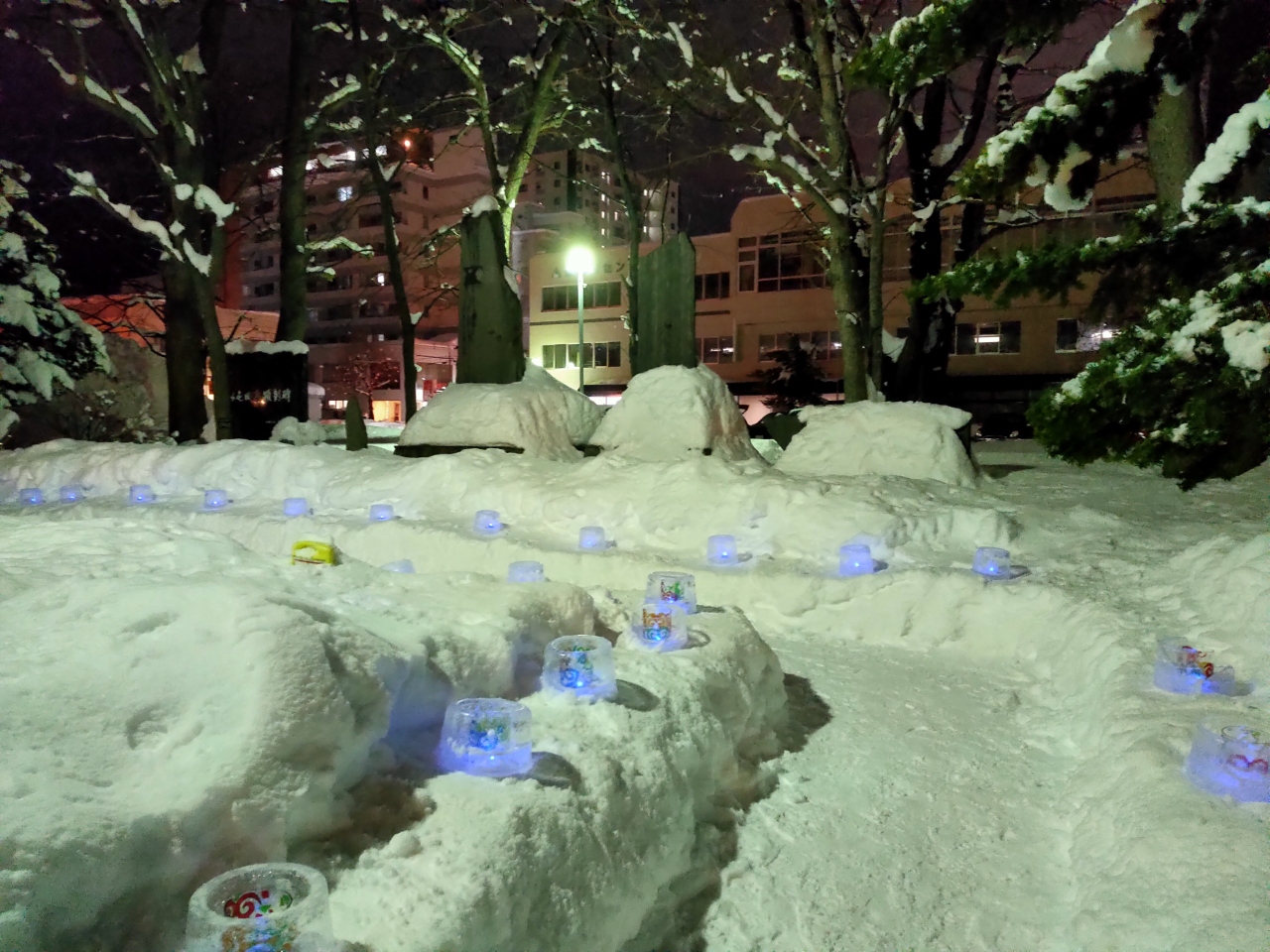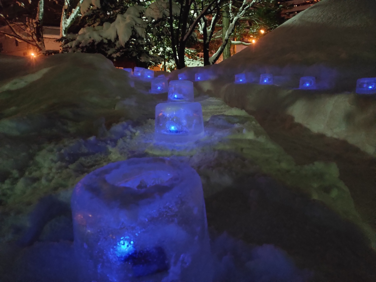 ただし、新型コロナウイルスの影響もあり、規模は小さくて素朴な感じで、西区役所前の屯田の森の通路沿いに幾つかのアイスキャンドルが飾られたほか、琴似栄町通りではかなりの間隔で、数えるほどしかありませんでしたが、小さく煌くロウソクの火(一部、電子ロウソク)が心を和ませてくれました。