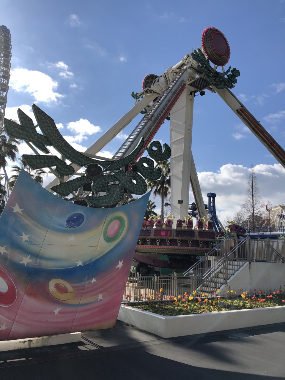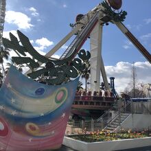 やじろべいのようにある二つの円の乗り物が回転しながら、ぶんぶんと動きます。