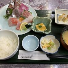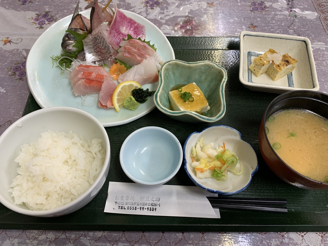 田京駅から歩いて伊豆のへそに行く途中、灯りがついていて営業している様子。口コミで見て、行きたかったのです。魚が美味しそうだったので。やった、ちと早めの夕ご飯。やっぱりここは地物の刺身定食でしょ。程なくしてきました。あら汁の美味しいこと。卵焼き、のりの佃煮も添えられてほんと美味しゅうございました。また来たい。