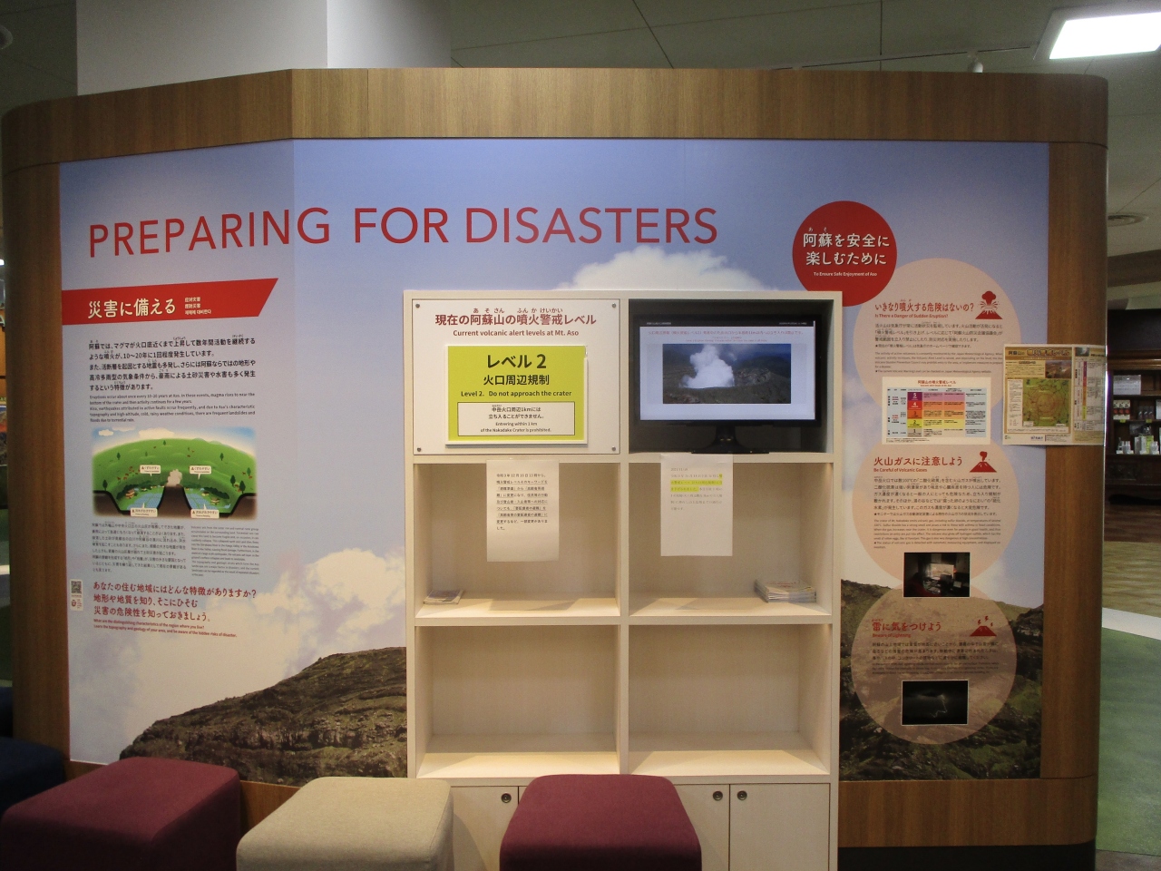 阿蘇周辺の自然についてや、噴火中の中岳についての詳細が案内されていて、大変興味深かったのですが、外に並べられている資料が英語、中国語、韓国語などで、日本語のものが全くなく、係の方へ声をかけて時間をかけて探していただき、入手できました。
