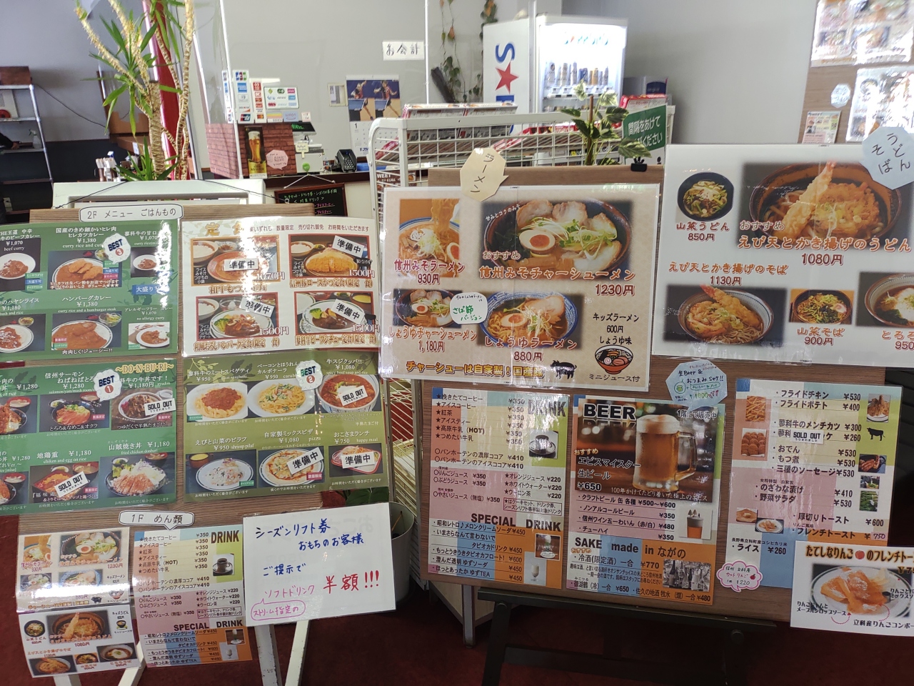 大きな窓からゲレンデがよく見え、快適に食事できました。カレーやお蕎麦、ラーメン、スパゲティー、ピラフ、山賊焼き丼、フライドチキン、おでん、もつ煮、牛乳、コーヒー、ジュース、クラフトビール、信州ワイン、冷酒などメニュー豊富です。